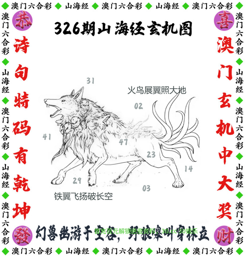 326期:【山海经玄机】开猪19 解释:火鸟展翼照大地,铁翼飞扬破长空解狗马兔 解料:幻兽幽游于空谷,野狼嗥叫穿林立解龙羊猪 综合:龙羊猪马狗兔 |